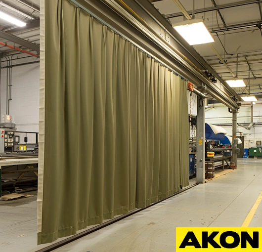 Hanging welding curtains can be used to isolate individual or multiple welding booths, or simply as a single dividing welding wall. AKON can take your design and make the hanging welding curtains into almost any configuration, depending on what you need. When your curtains are hung from above, retracting them grants you a completely open space. They also have the ability to roll around the corner, utilizing radius corners.