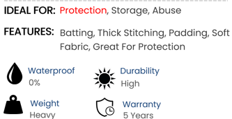 Our padded covers use a durable 700D polyester outer skin with quilted padding inside for impact resistance. The fabric is tough, tear-resistant, and designed for repeated handling.