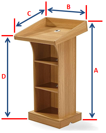 Measure the podium’s width (Side A), depth (Side B), height (Side C), and any extended base (Side D) in inches. Include any protrusions. We add slack on all sides except height for a proper fit.