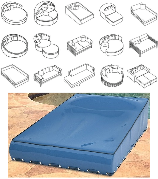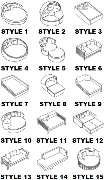 Choose from 15 preset styles (rectangular, L-shape, curved, canopy, chaise-plus, etc.) or submit custom dimensions for unique day beds and loungers.