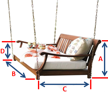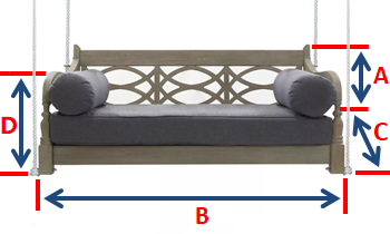 Measure in inches: Side A (width), Side B (length), Side C (height from floor/deck to top of cushions or canopy), and Side D (drop/clearance needed for chains or ropes). We add slack on all sides except height.