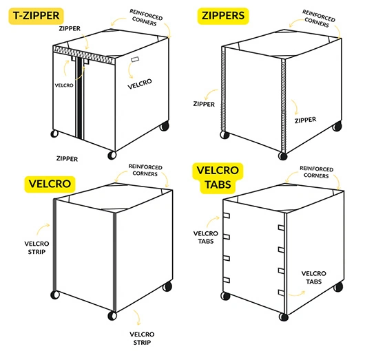 Select from zippers, hook-and-loop seams, buckle straps, hem drawcords, and reinforced grommets. These features keep the cover secure during movement and help maintain cleanliness in controlled areas.