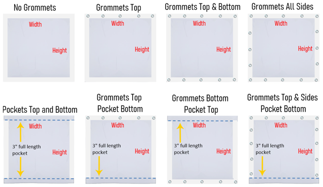 Grommets: Rust resistant, on corners + every 18" (If you need different spacing, just tell us on the notes portion of the order form) Most common and versatile mounting option.