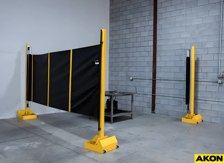 If you want the ability to move the posts around, then the shade can be mounted to a portable post that tips backwards to be rolled out of the way. View our SB-5000 Portable Welding Screens which uses the same shade on a wheeled post.