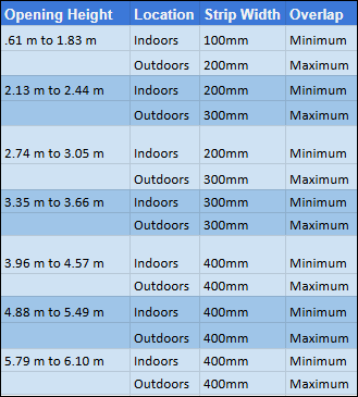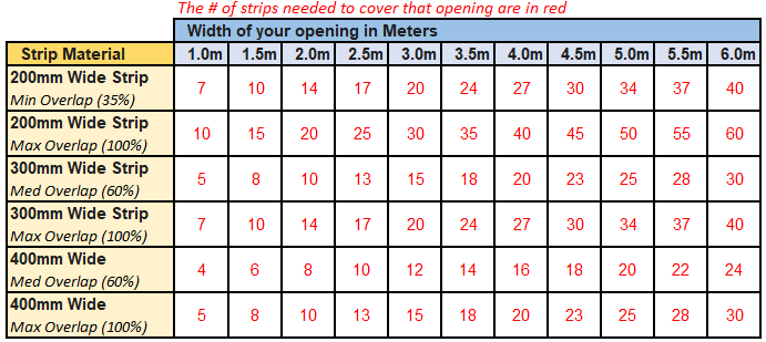 The table below shows you how many strips you will need to cover your opening (regardless of the height). For instance, a 3.0m wide opening using 200mm strips with Minimum Overlap would need 20 strips to cover the area. If you had an 8.0m opening (which is wider than what is on this chart), you would take the requirement for a 4.0m opening x 2.